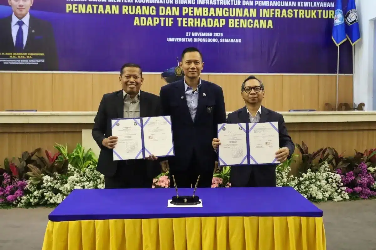 UNDIP, Semarang (27/11) – Universitas Diponegoro sukses menggelar Kuliah Umum Menteri Koordinator Bidang Infrastruktur dan Pembangunan Kewilayahan RI, Dr. H. Agus Harimurti Yudhoyono, M.Sc., MPA, M.A., pada Kamis, 27 November 2025 di Gedung Prof. Sudarto, S.H., Kampus UNDIP Tembalang. Mengusung tema ‘Penataan Ruang dan Pembangunan Infrastruktur Adaptif terhadap Bencana’, kegiatan ini menjadi bagian dari dukungan UNDIP terhadap arah kebijakan Diktisaintek Berdampak serta komitmen pembangunan nasional yang inklusif dan berkelanjutan.