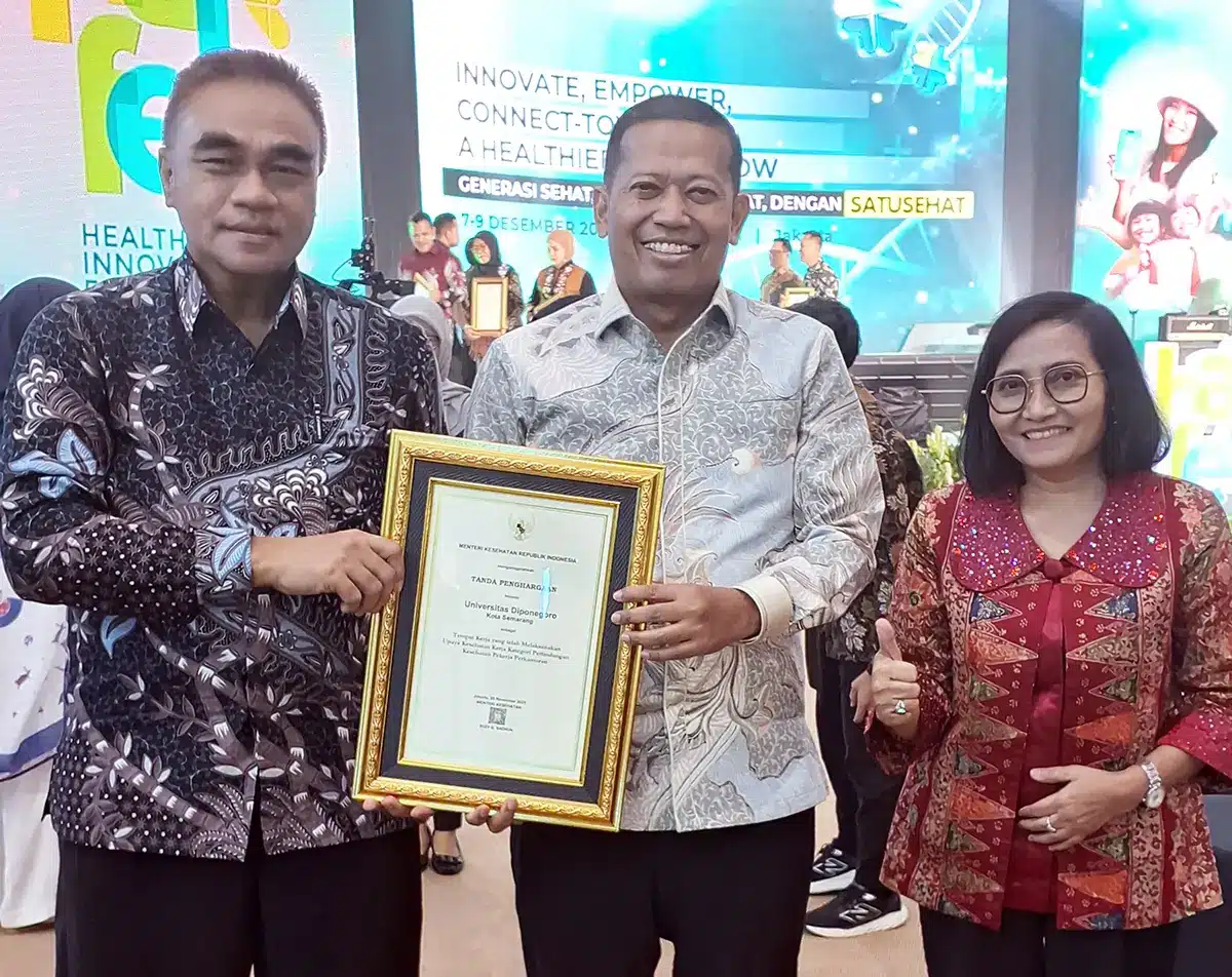 UNDIP, Jakarta (8/12) – Universitas Diponegoro (UNDIP) meraih Penghargaan Mitra Bhakti Husada Tahun 2025 dari Kementerian Kesehatan Republik Indonesia untuk kategori Perlindungan Kesehatan Pekerja Perkantoran. Piagam penghargaan diserahkan langsung kepada Rektor UNDIP, Prof. Dr. Suharnomo, S.E., M.Si., dalam acara penganugerahan di Balai Kartini Jakarta, Senin (8/12).