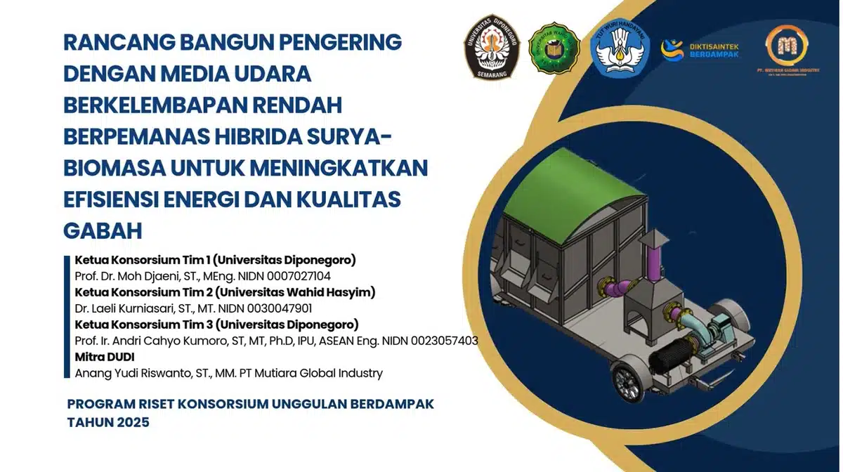 UNDIP, Semarang (3/1) – Universitas Diponegoro (UNDIP) terus memperkuat perannya sebagai perguruan tinggi riset dengan menghadirkan inovasi teknologi tepat guna yang berdampak langsung bagi masyarakat. Salah satunya melalui inovasi teknologi terbaru berupa pengering gabah melalui media udara berkelembapan rendah dengan pemanas hybrid surya-biomassa. Teknologi ini dirancang untuk meningkatkan efisiensi energi dan menjaga kualitas gabah kering giling secara lebih cepat dan konsisten.