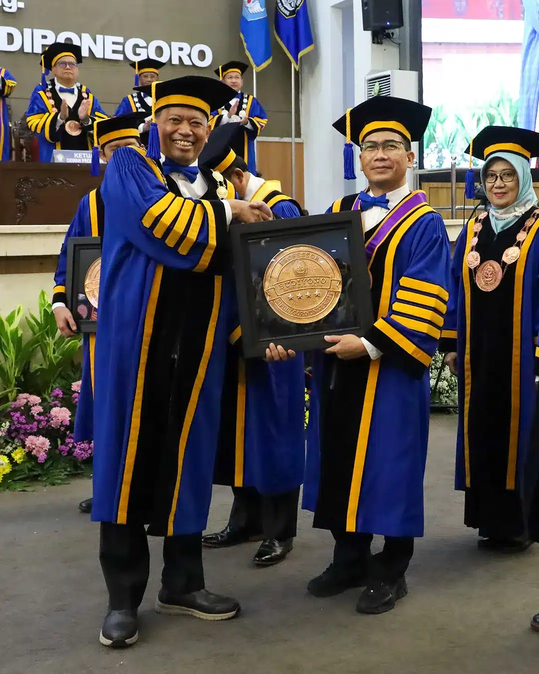 Prof. Suharnomo menambahkan bahwa UNDIP senantiasa hadir dalam situasi krisis nasional sebagai bentuk empati kebangsaan. “Sebagai bagian dari NKRI kita juga sangat tanggap untuk bencana di Sumatera. Kita sudah mengirim lebih dari 10 tim untuk ke sana,” ungkapnya. Di akhir sambutannya, Rektor UNDIP berharap para Guru Besar yang dikukuhkan hari ini bisa memberikan kontribusi bagi institusi dalam meraih reputasi tinggi di level global dan menjadi aktor terdepan dalam menjadikan UNDIP Bermartabat dan Bermanfaat. (Komunikasi Publik/UNDIP/Riri)