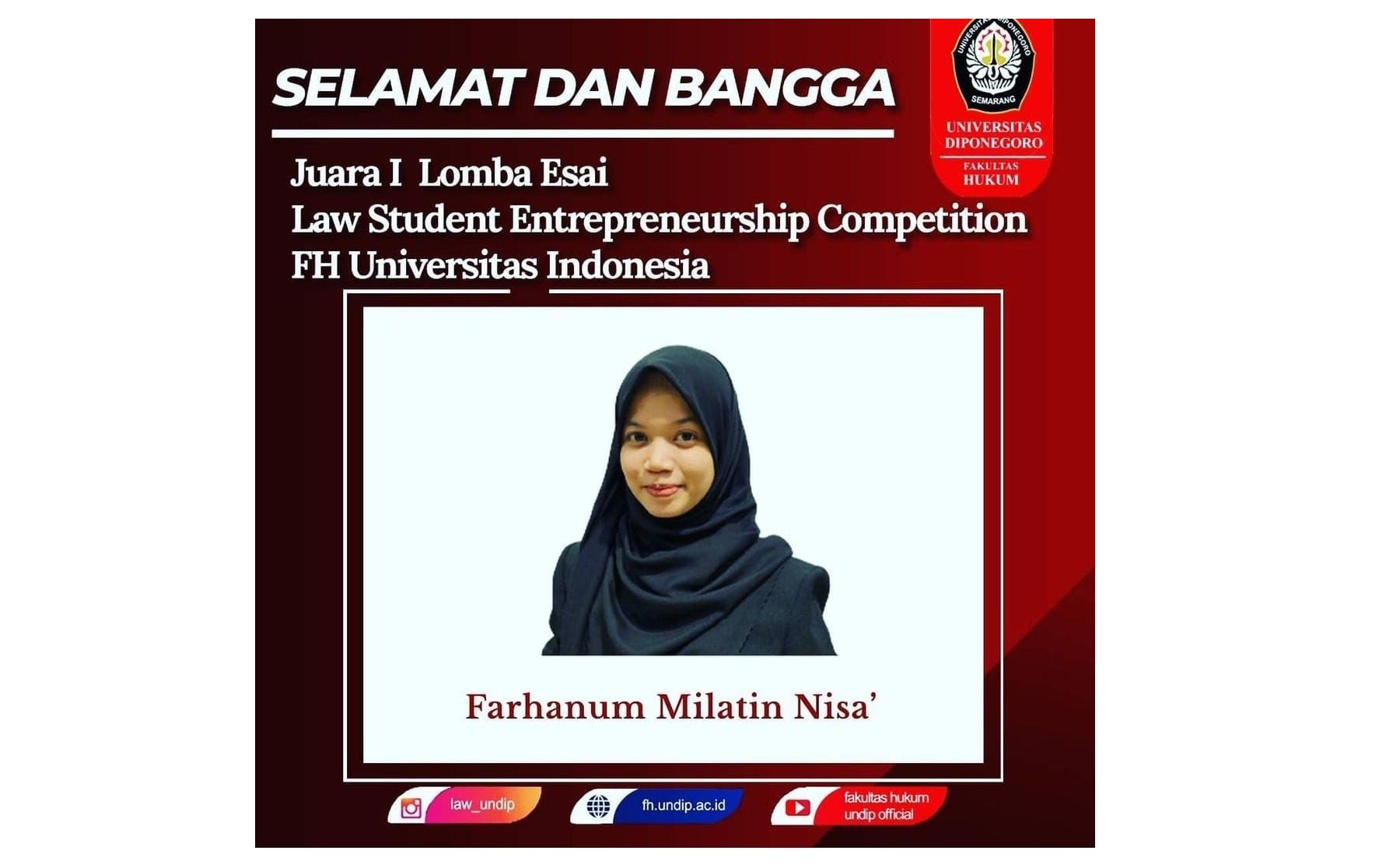 SEMARANG- Perasaan bangga masih dirasakan oleh Farhanum Milatin Nisa’ (23) tahun, usai dinobatkan menjadi Juara I dalam lomba Esai Law Student Entrepreneurship Competition yang diselenggarakan